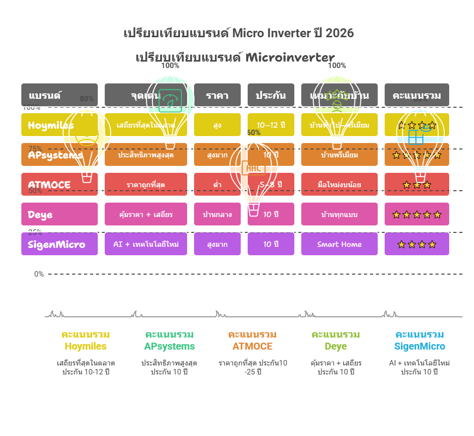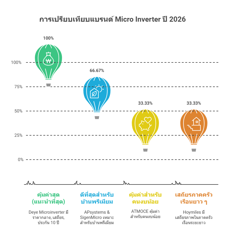 | Hoymiles | เสถียรที่สุดในตลาด | สูง | 10–12 ปี | บ้านทั่วไป–พรีเมียม | ⭐⭐⭐⭐ |