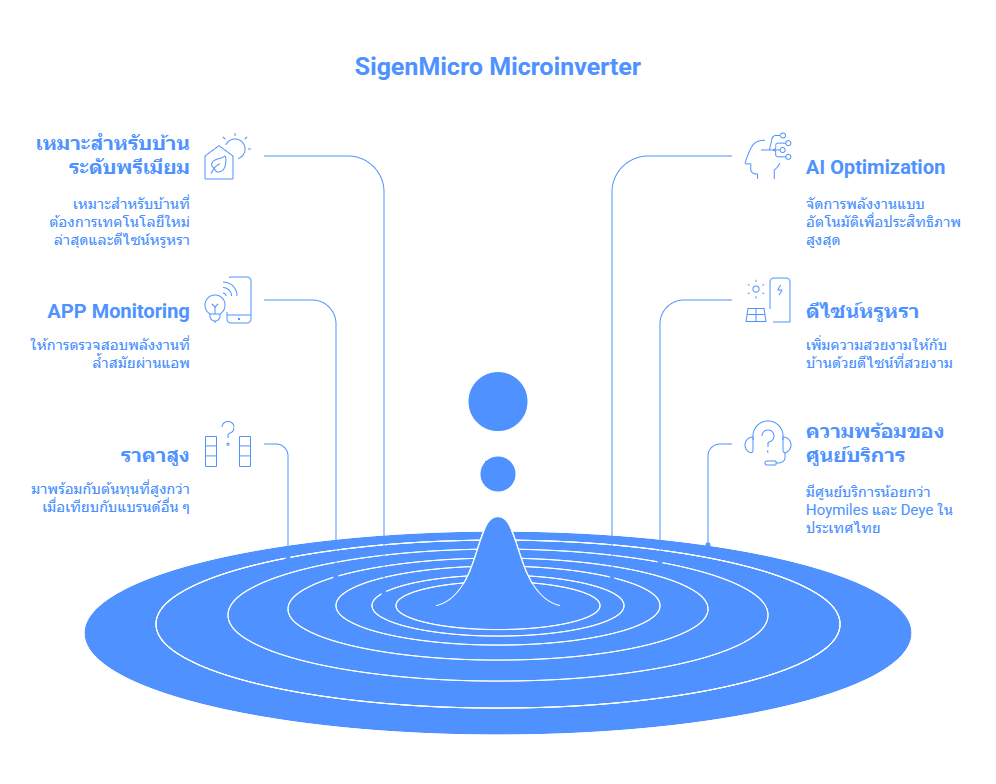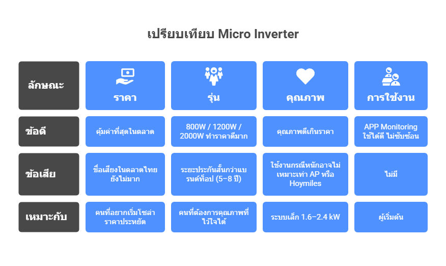 | APsystems | ประสิทธิภาพสูงสุด | สูงมาก | 10 ปี | บ้านพรีเมียม | ⭐⭐⭐⭐⭐ |