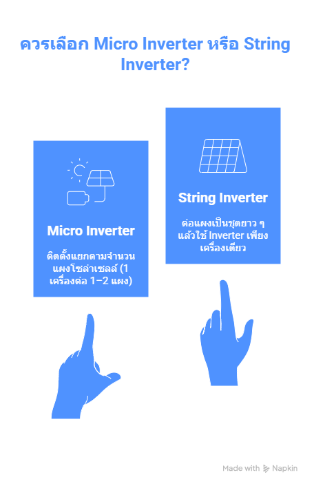 Micro Inverter คืออินเวอร์เตอร์ที่ติดตั้ง แยกตามจำนวนแผง (1 เครื่องต่อ 1–2 แผง) ต่างจาก String Inverter แบบเดิมที่ต่อแผงเป็นชุดยาว ๆ แล้วใช้ Inverter เพียงเครื่องเดียว