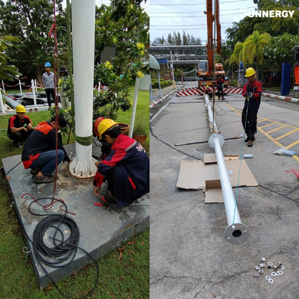 เมื่อติดตั้งเสาเสร็จเรียบร้อย เรานำกังหันลมขึ้นไปติดตั้งบนยอดเสา จากนั้นเชื่อมต่อระบบไฟฟ้าเข้ากับอินเวอร์เตอร์เพื่อให้สามารถแปลงพลังงานลมมาใช้งานได้