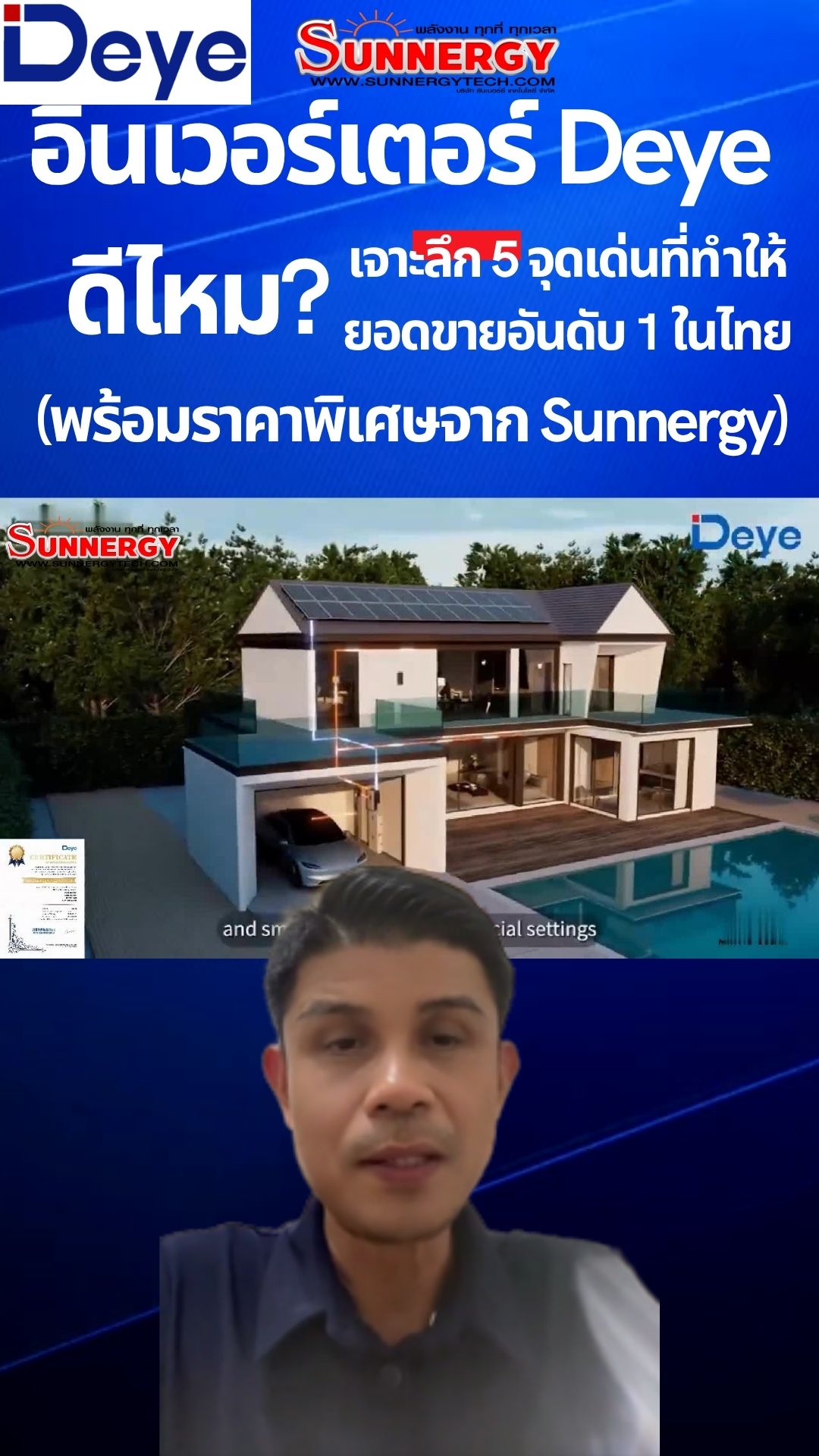 ซันเนอร์ยี่ (Sunnergy) ในฐานะผู้เชี่ยวชาญด้านโซลาร์เซลล์และตัวแทนจำหน่ายอินเวอร์เตอร์ Deye อย่างเป็นทางการ เราขอยืนยันว่า Deye คือผู้นำด้านเทคโนโลยีและประสิทธิภาพที่คุ้มค่าที่สุดในปัจจุบัน บทความนี้จะเจาะลึก 5 จุดเด่นที่ทำให้ Deye กลายเป็นเบอร์ 1 ในไทย และเหตุผลที่คุณควรเลือกติดตั้งกับ Sunnergy เพื่อรับราคาที่ดีที่สุดและการรับประกันที่เหนือกว่า