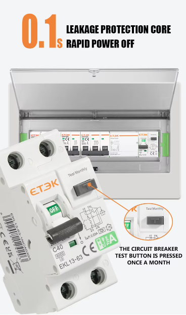 Test button should be pressed at least once per month: ปุ่มทดสอบ (Test Button) ควรถูกกดเพื่อทดสอบการทำงานของระบบป้องกันไฟรั่ว อย่างน้อยเดือนละครั้ง เพื่อให้มั่นใจว่าอุปกรณ์ยังทำงานปกติ