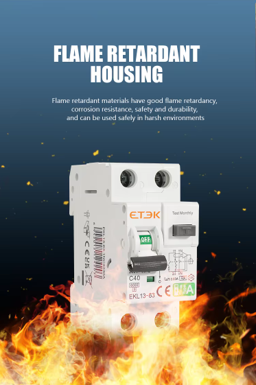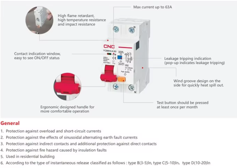 ภาพนี้แสดงถึงคุณสมบัติทางกายภาพและฟังก์ชันการทำงานของ RCBO ซึ่งเป็นอุปกรณ์ที่ออกแบบมาเพื่อความปลอดภัยในการใช้งานในอาคารพักอาศัย