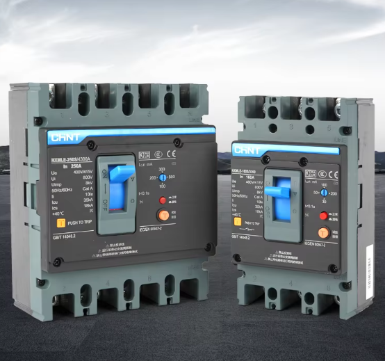 ภาพนี้แสดงเบรกเกอร์สองรุ่นในซีรีส์ NXMLE ซึ่งเป็น MCCB ที่มาพร้อมฟังก์ชันป้องกันกระแสไฟฟ้ารั่ว (Earth Leakage Protection) เหมาะสำหรับใช้เป็นเมนเบรกเกอร์ในตู้ควบคุมไฟฟ้าขนาดใหญ่