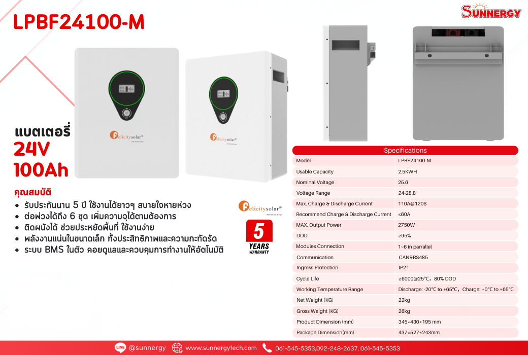 Felicitysolar LPBF24100-M Battery LiFePO4 แบตเตอรี่โซล่าเซลล์ ชนิดลิเธียมฟอสเฟต 24V 100Ah