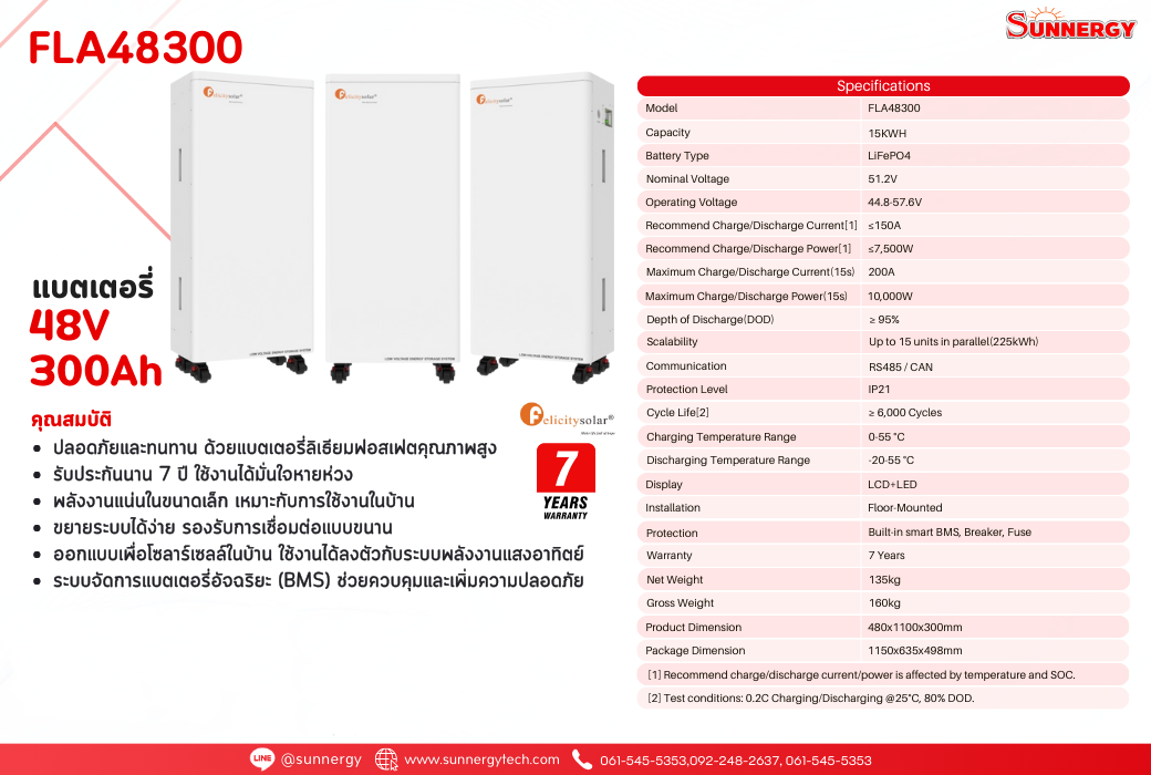 Felicitysolar FLA48300 เป็น แบตเตอรี่ LiFePO4 ขนาด 300Ah 48V ที่ออกแบบมาเพื่อตอบโจทย์การใช้งานกับ ระบบพลังงานแสงอาทิตย์, ระบบสำรองไฟ และโซลูชันไฟฟ้าอุตสาหกรรม รองรับโหลดหนักต่อเนื่อง ให้พลังงานสเถียร มาพร้อม BMS อัจฉริยะ ป้องกันโอเวอร์ชาร์จ ไฟลัดวงจร และคายประจุเกิน อายุการใช้งานยาวนานกว่า 6,000 รอบ